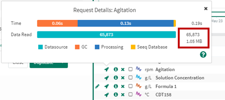 In Seeq Workbench, you can view the data involved in calculating and displaying a particular item on screen by clicking the rocket icon. The resulting popover will show the number of datums (samples and/or capsules) read and the corresponding total usage in B/KB/MB/GB.