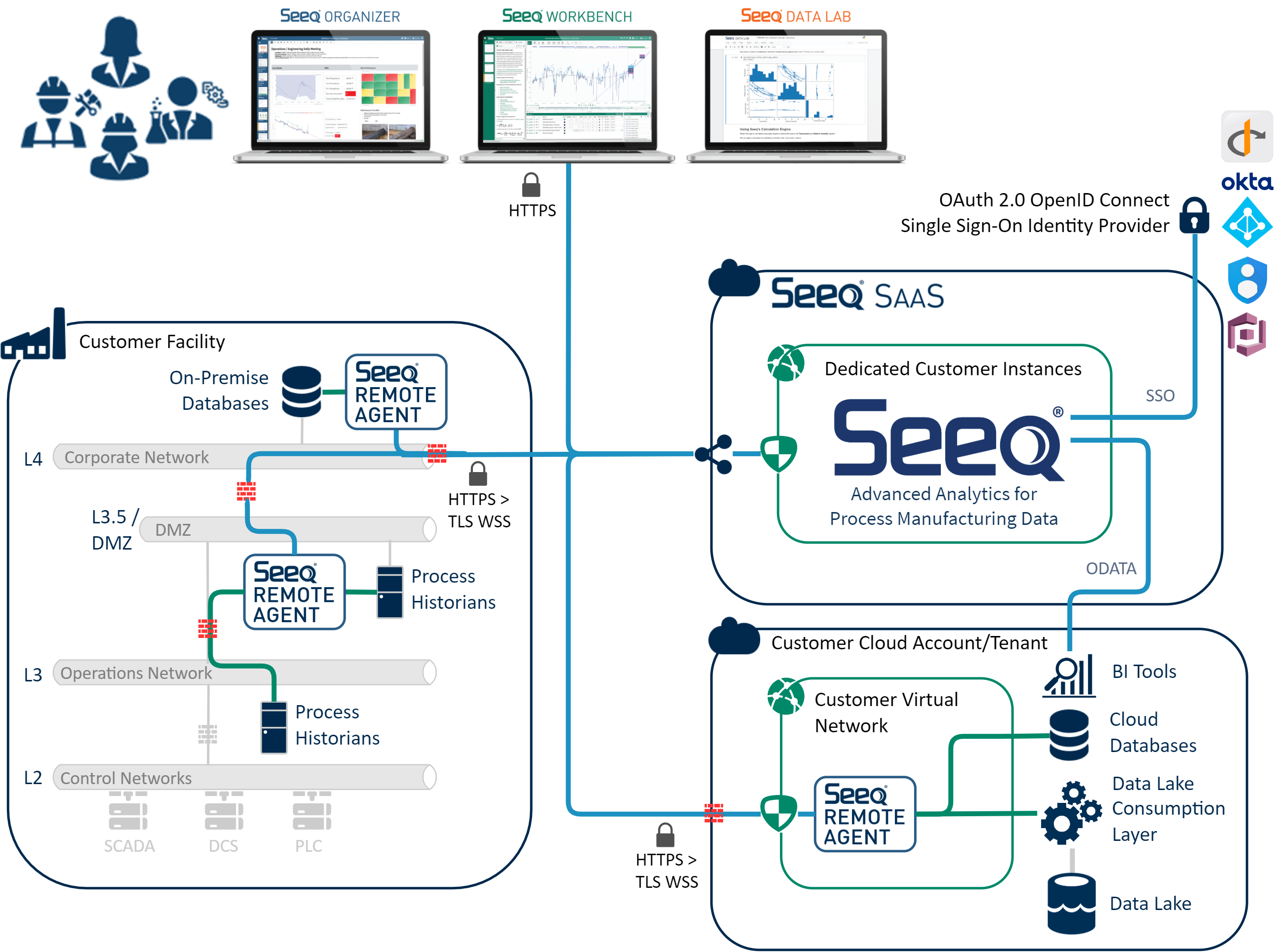 Accommodate network security and firewall architectures. For example, you may install a Remote Agent at level 3.5 or 4 (referencing the Purdue Model) and communicate to a Seeq SaaS.