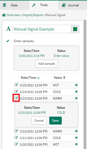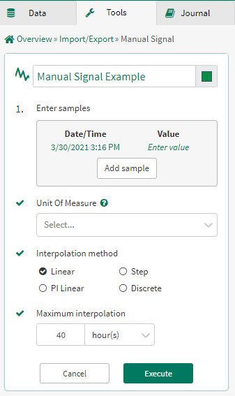 The Manual Signal tool can be used to create a signal manually by entering timestamp and value pairs.