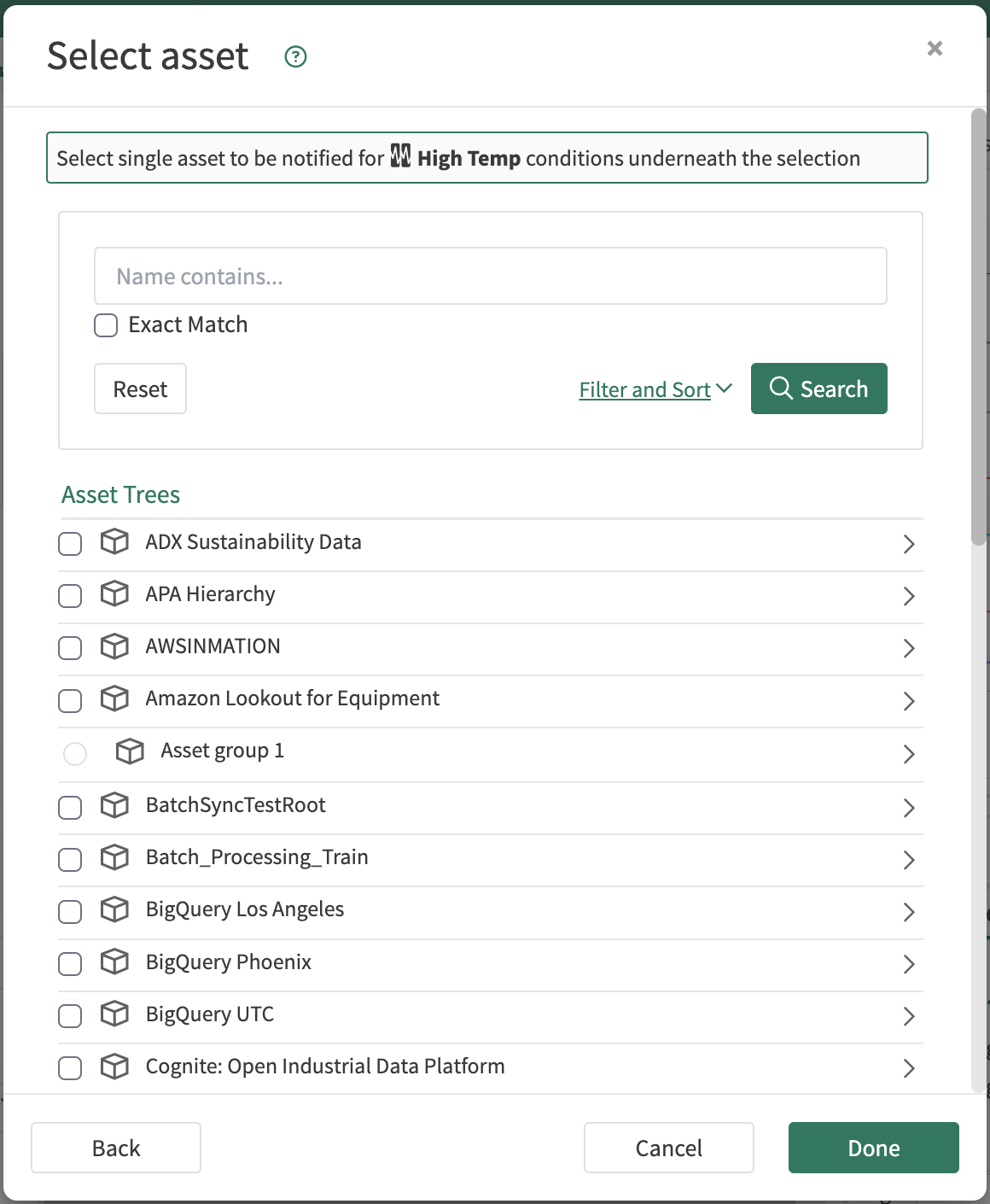 If you would like to change the asset selection, click “Select asset” to get the full list of assets and choose which level to search under for matching assets that the condition can swap to.