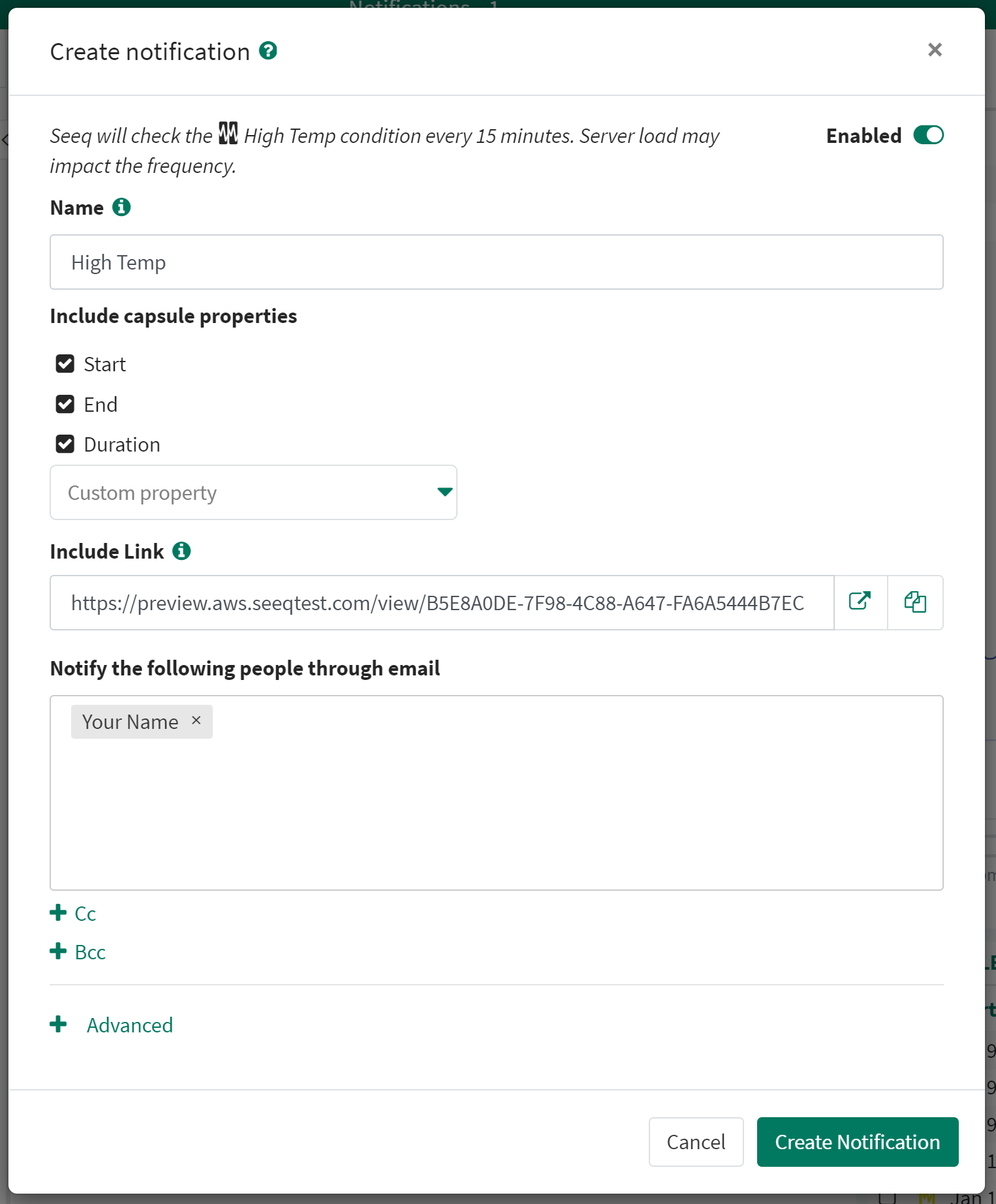Enabled: This means Seeq will check for the condition on the frequency specified to the left. If you switch the toggle to Disabled, the notification settings will be saved but Seeq will not check for new capsules and you will not receive emails based on this condition.