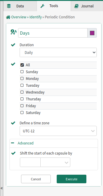 Under Advanced options, the user can Shift the start of each capsule by a specified time interval for the periodic condition to reference.