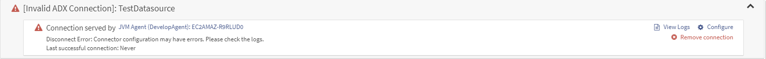 In some cases, the issue with the connection might be caused by an invalid datasource configuration. This will be reflected in the Disconnect Error as shown below.