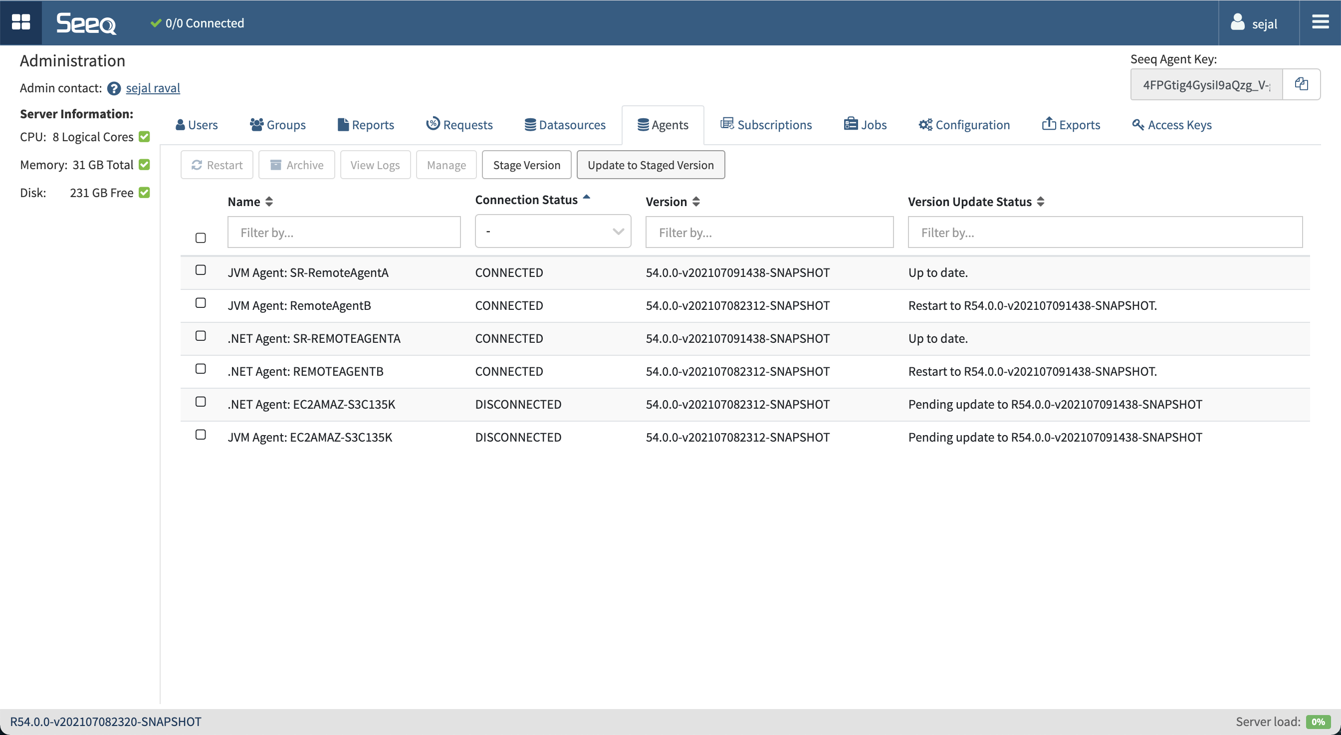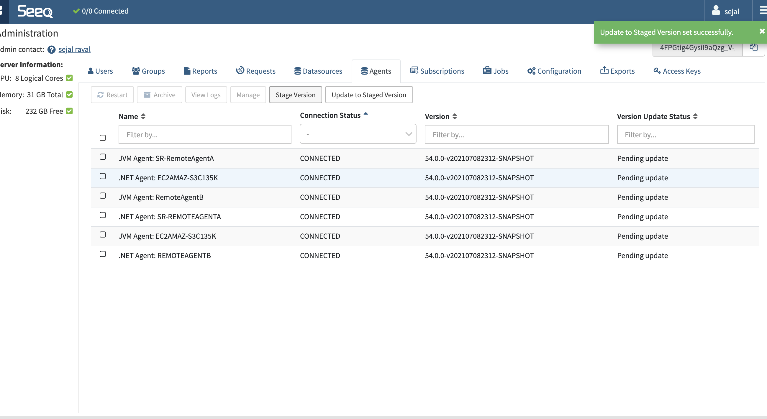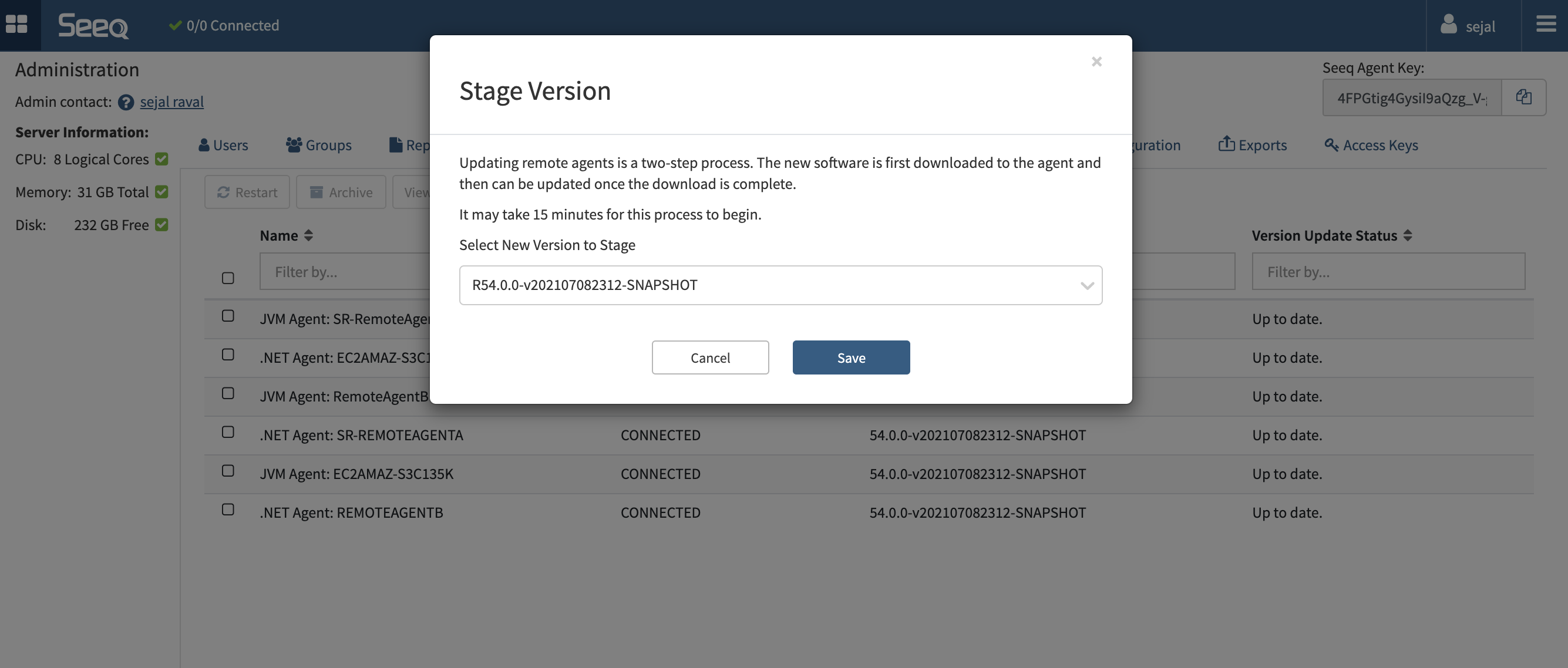 Agents receive this directive in 15 minutes of being set and switch the current version to the staged version. Seeq restarts on the agent, so the ‘Connection Status’ on UI displays Disconnected briefly.
