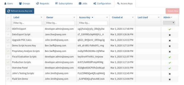 Administrators can view all access keys from the Access Key tab on the Admin Panel. This panel will show the user, Access Key label, date created, and date last used. It also indicates if the access key has admin privileges. Administrators can delete keys from this panel.
