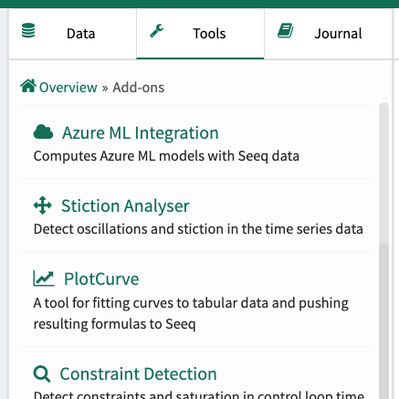 Data Lab Functions is a Jupyter Notebook that provides a REST API. The API is callable by authenticated and authorized Seeq users. It is typically developed in Python. Adding an endpoint is as easy as adding # GET /my-endpoint to the top of a Jupyter Notebook cell. Quick loading and advanced applications can be developed by using Data Lab Functions for the backend and Frontend Plugins for the user interface. The Add-on Manager itself is implemented as a Home Screen Plugin frontend with a Data Lab Functions backend.