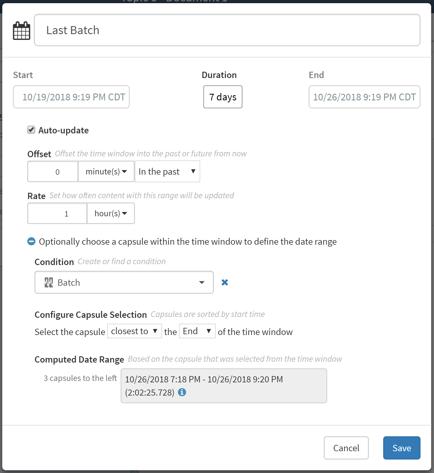 • Duration  - This is the window of time you are searching (similar to the Display Range in Workbench Analysis). Make sure it is large enough to have the capsule you are interested in within the range.