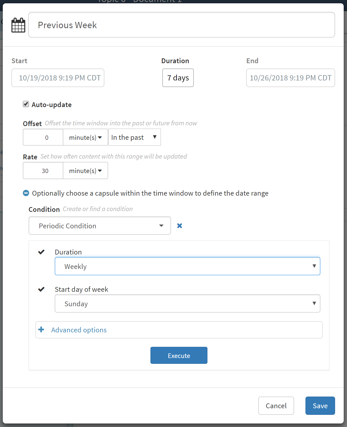 This selection is very similar to Periodic Conditions. One Example would be the previous week (Sunday to Saturday no matter what day today is).