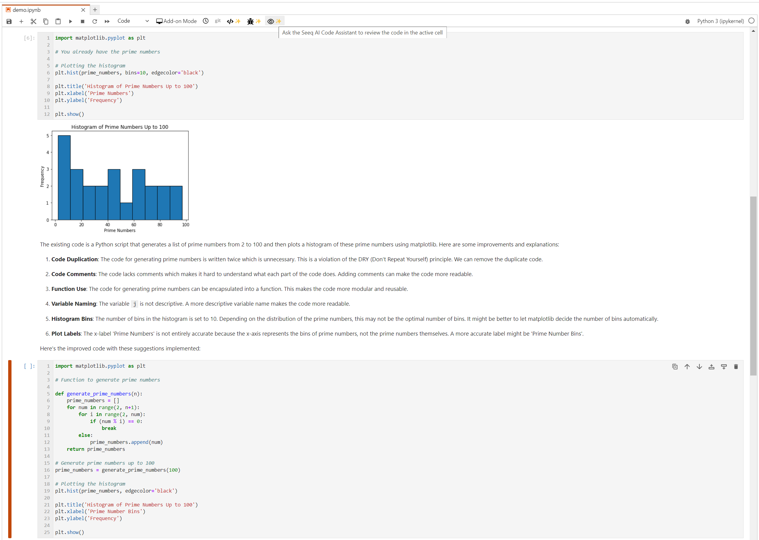 An example is shown in the figure below, the AI Assistant reads your active cell and provides a detailed explanation of your code in a markdown cell below followed by a code cell after that with the suggested improve code.