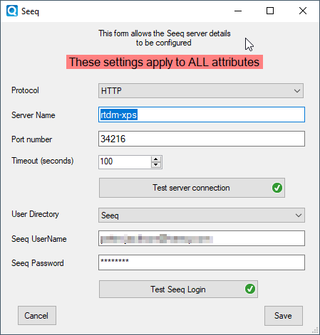 Once valid details have been entered clicking "Save" will store these details to the AF Configuration Database. These details will then be used by all Seeq AF Attributes configured on the AF server.