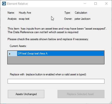 This displays the asset which the formula uses and allows it to be "swapped" by typing in a replacement asset path. The "Replace Selected Asset" button is enabled when a valid Seeq path has been entered. Once this button is pressed, the asset swap is performed. Should the swap fail the user is informed and allowed to enter an alternative path. To cancel out completely without configuring the attribute press the "X" in the upper right-hand corner.