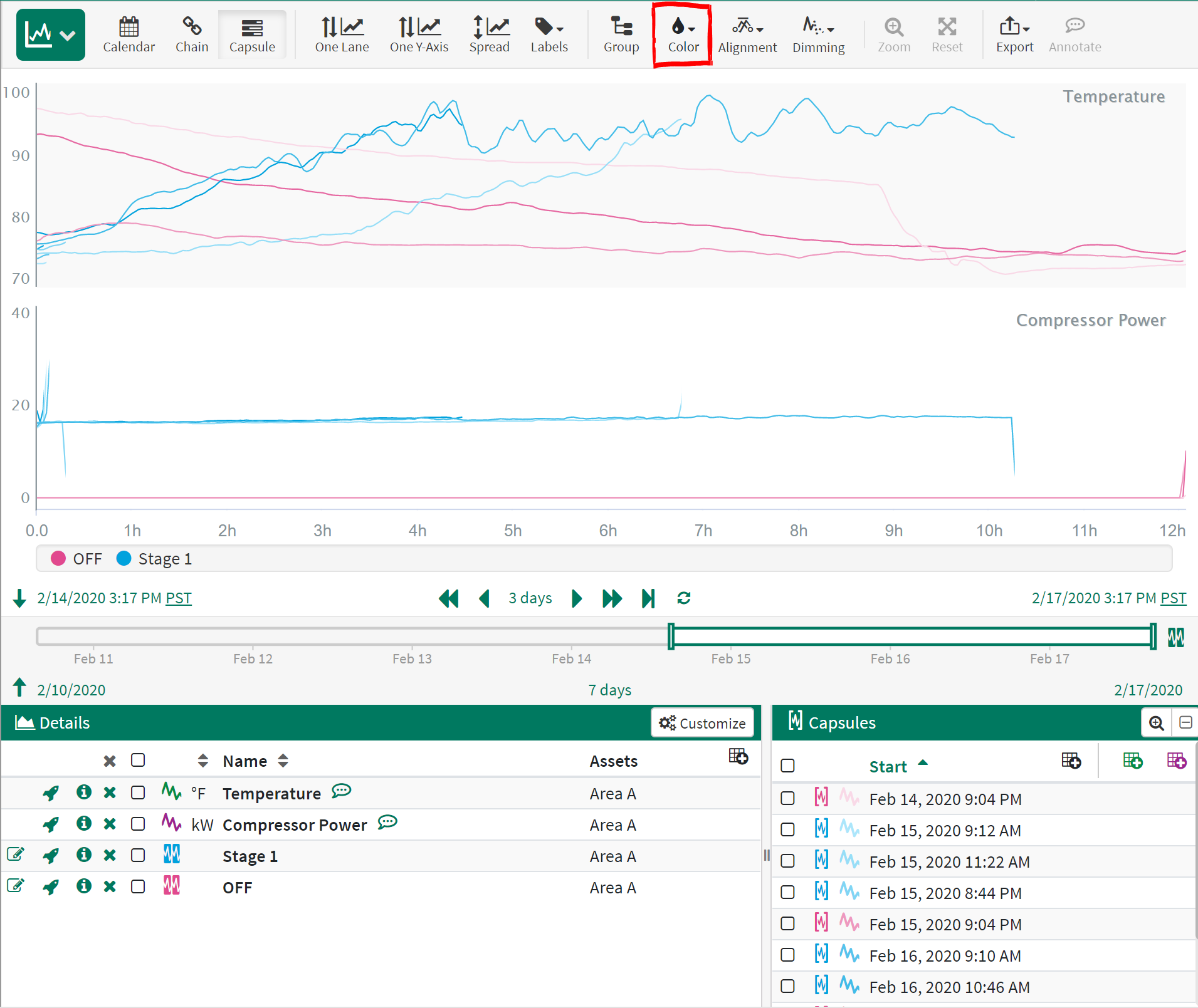 Rainbow will apply a distinct color to all the signals trended within capsules so that two or more different signals in the same capsule can be readily determined without needing to select them.