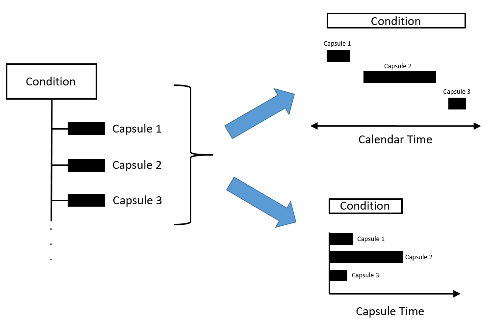 A Condition is a collection of capsules that are defined with the same logic. Think of that logic defining a condition such as "high-load." Conditions can be represented in many forms–such as a table, plotted along calendar time, and plotted as relative to the start of each capsule.
