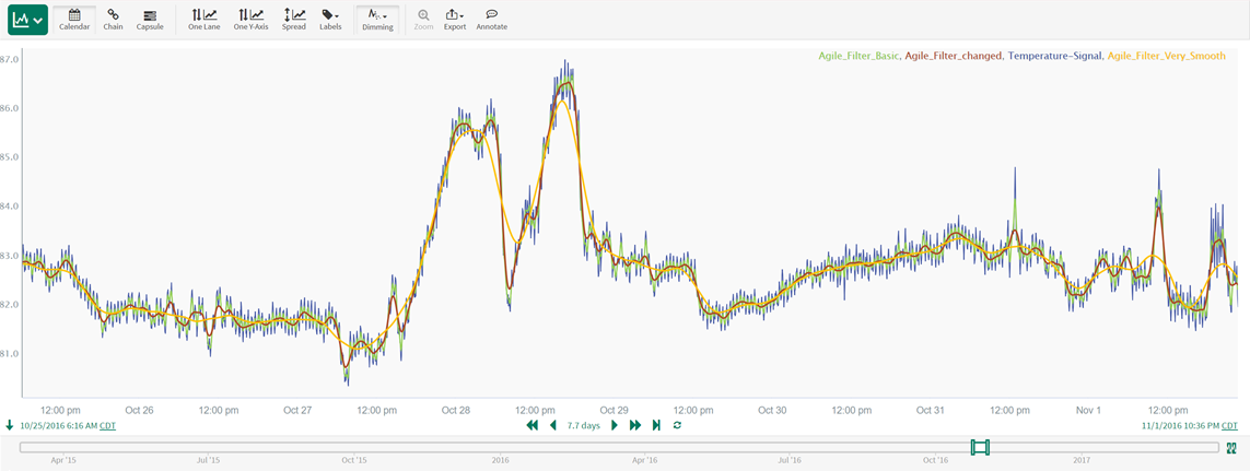Depending on the nature of the process data and the analysis goals, we may select different types of filters for data smoothing. For the examples in this article, we will use a type of low pass filter, called Agile Filter due to these advantages:
