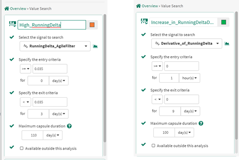 To implement this method, we use the following inputs to the Value Search Tool to create new conditions for High_RunningDelta and Increasing_RunningDelta: