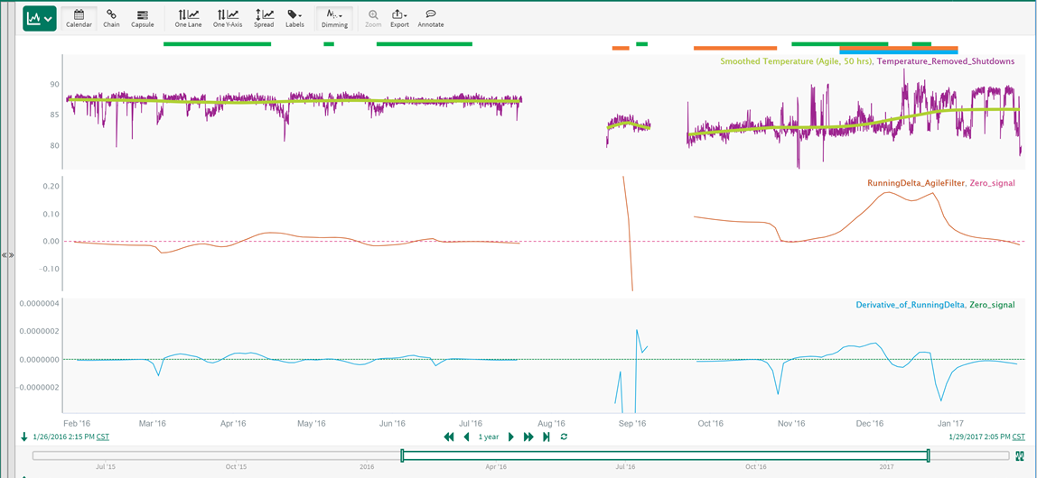 This is achieved with the following formulas to generate two new signals named RunningDelta_AgileFilter (lane 2 in the trend below) and Derivative of RunningDelta (lane 3 in the trend below):