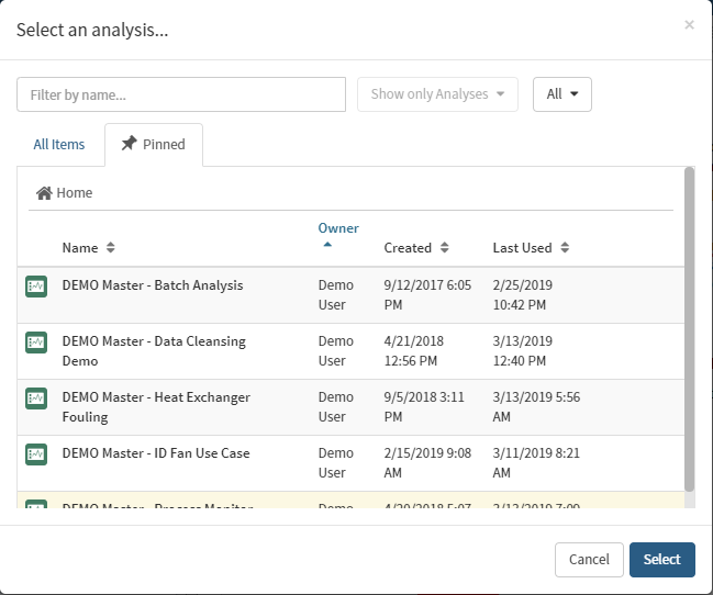 First navigate to and select the Analysis or Vantage from the menu. Note all filtering and search functions available on the home page can be applied (Public Items, My Items, etc.). Pinned workbooks are also available through this interface.
