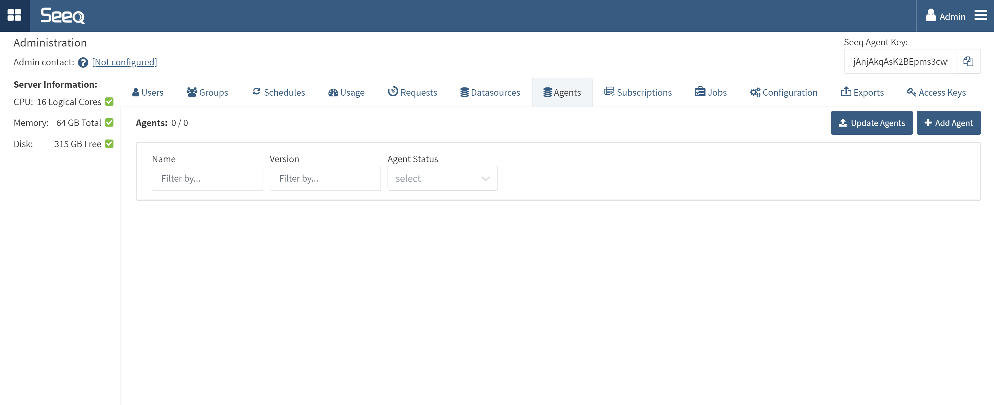 First, access your Seeq SaaS installation, go to the Administration page, and in the Agents tab, click the + Add Agent button:
