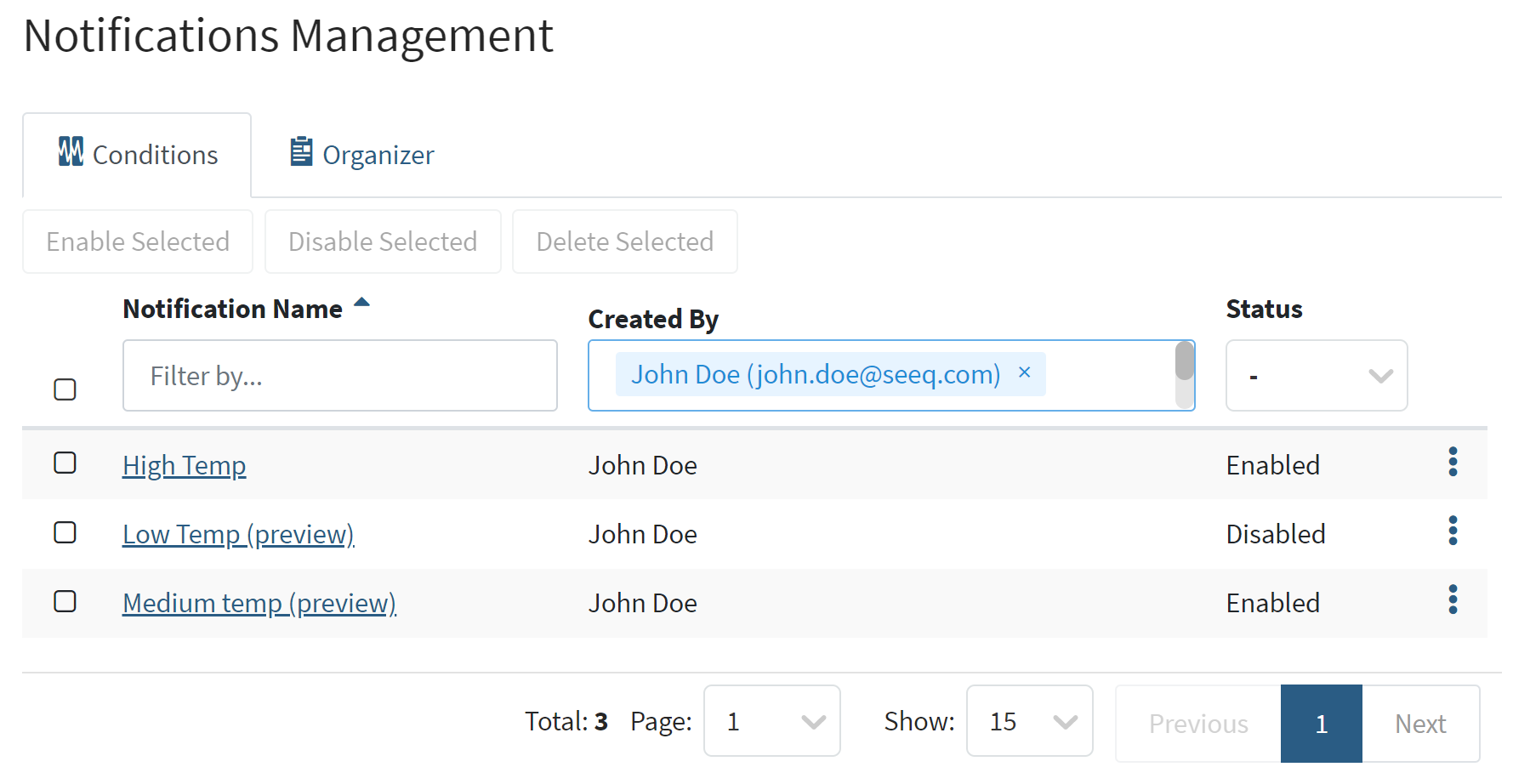 On the Notifications Management page you will see all the notifications that you have created across any Seeq Workbench or Organizer Topic in the respective tabs. If you are an admin you will see all notifications (not just the ones you created). You can enable, disable, and delete notifications in bulk by using the check boxes on the left and the bulk action buttons at the top of the table. You can edit an individual notification by clicking the name of the notification or clicking the menu on the right of the row.
