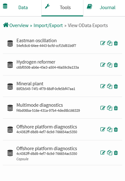 Six tables are available within each OData Export: Information, Items, Samples, Capsules, Statistics, and StatisticsSignalsWithinCapsules.