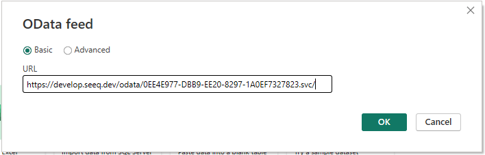 Navigate to the "Get Data" dropdown → OData. Insert the export URL and click OK.