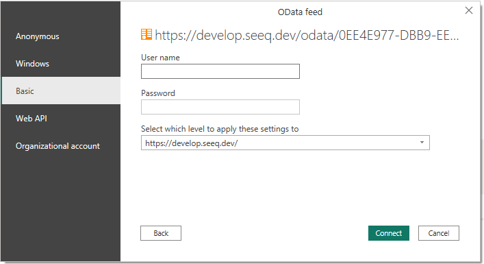 Users can authenticate the OData feed using a Seeq Access Key or username & password. Alternatively, if Seeq is set up with Windows Auth and a user is reading an OData export in a Windows product (e.g. Excel, Power BI), the user can authenticate the OData feed seamlessly.