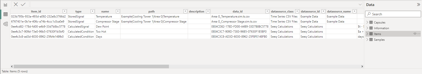 Note: For items coming from asset trees, Seeq includes the asset pathway along with the item name in column names. If trying to split this name based on a delimiter in the other application, the character Seeq uses to separate the asset pathway is ǀ (Unicode U+01C0). This is due to the OData standard’s column name limitations and to avoid accidental splits on strings that may contain other characters readily available on the keyboard.