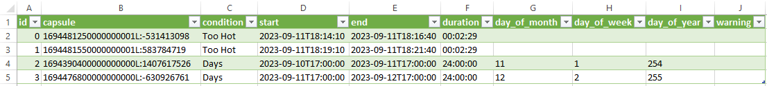 Capsule mode represents a signal segment within each capsule. This data includes the same columns as Calendar/Chain mode, but also include the condition’s ID, the capsule’s ID, and the time this sample is located relative to the capsule’s start (in minutes).