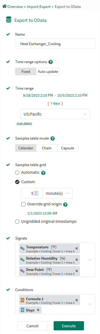 Note: The columns output by legacy OData exports are based on the signal and condition names & asset paths. If any duplicate columns are present, it can cause errors for some clients. If exports with duplicate columns are defined, archive those exports and clear your client cache to fix the issue.