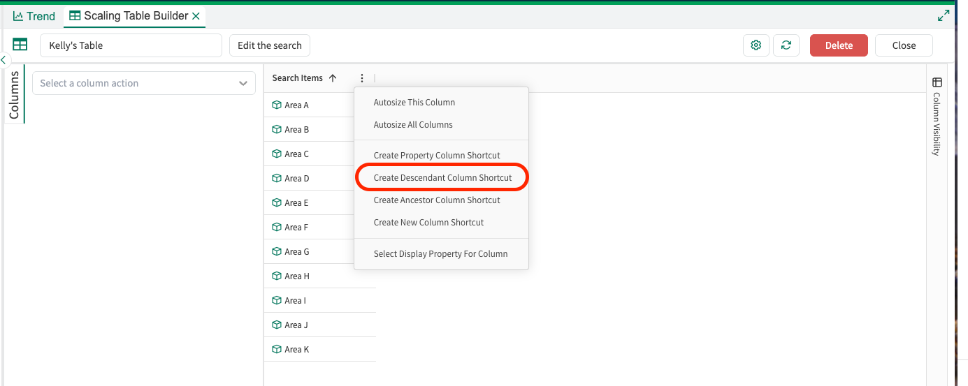 Shortcuts are another way to quickly populate new columns with properties, descendants, and ancestors. If you’ve started your Scaling Table by doing a Property Search for assets, using the Create Descendant Column Shortcut is the fastest way to bring in your signals, scalars, or conditions associated with each asset to be able to start building calculations. Ancestors allow you to navigate up layers in your tree, and the property shortcut lets you extract information from the items in that column.