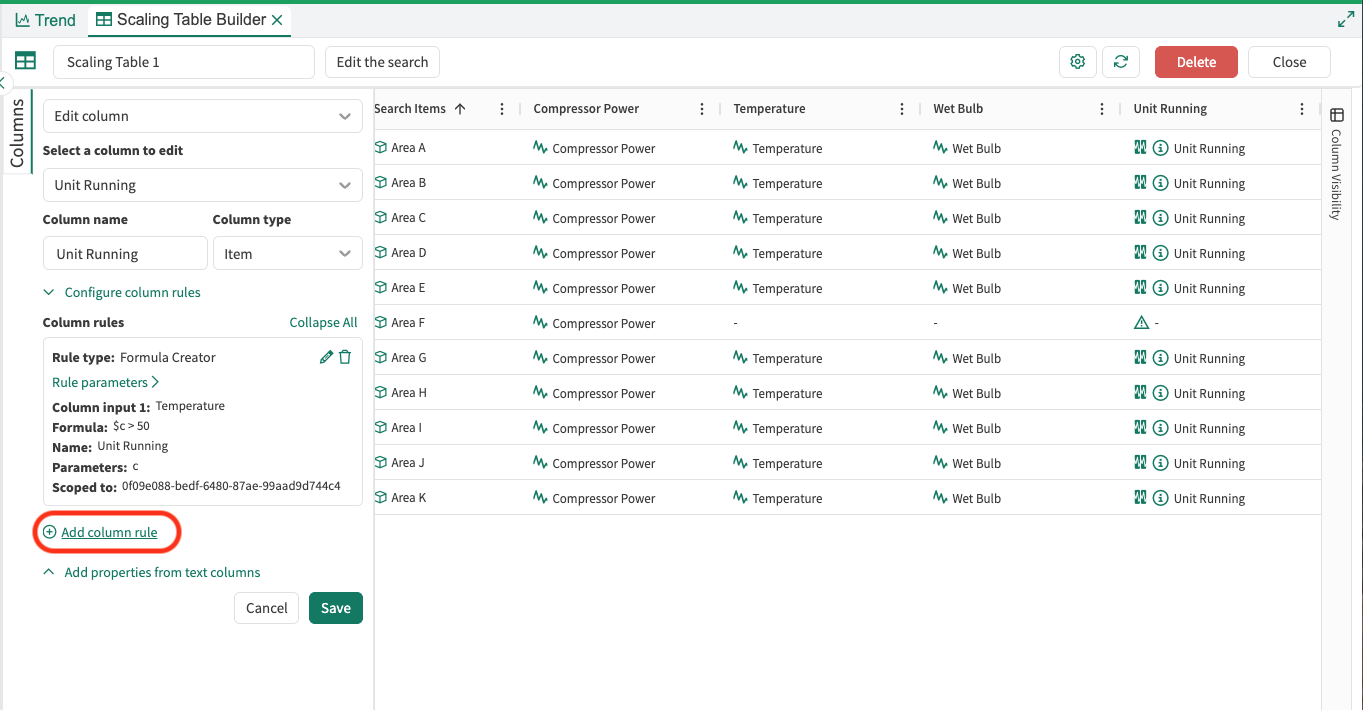 Once you have some signals, conditions, and/or scalars in your table, one of the most commonly used rules is the Formula Creator. Similar to the Formula Tool in Seeq Workbench, this allows you to create new calculations for all of the applicable rows of your table. The formula syntax is the same that you use in the Formula Tool.