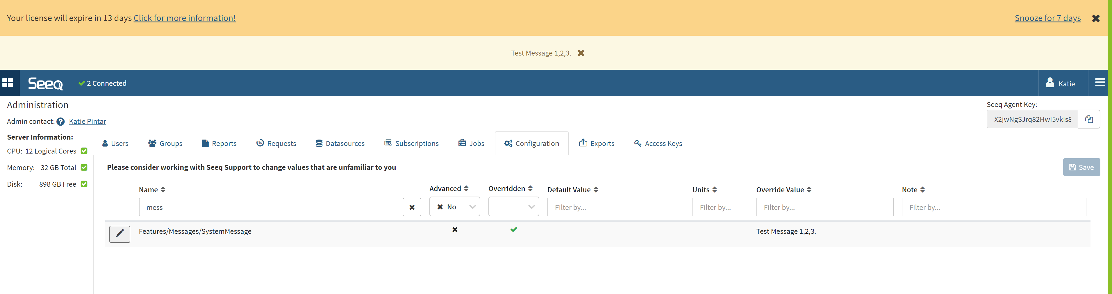 To enable a system message, navigate to the Configuration tab of the Administrator page. Filter the list by the name column for “messages” to find Features/Messages/SystemMessage. Click the “Override the default value” checkbox and add the message as needed in the text box below. Save to broadcast the message.