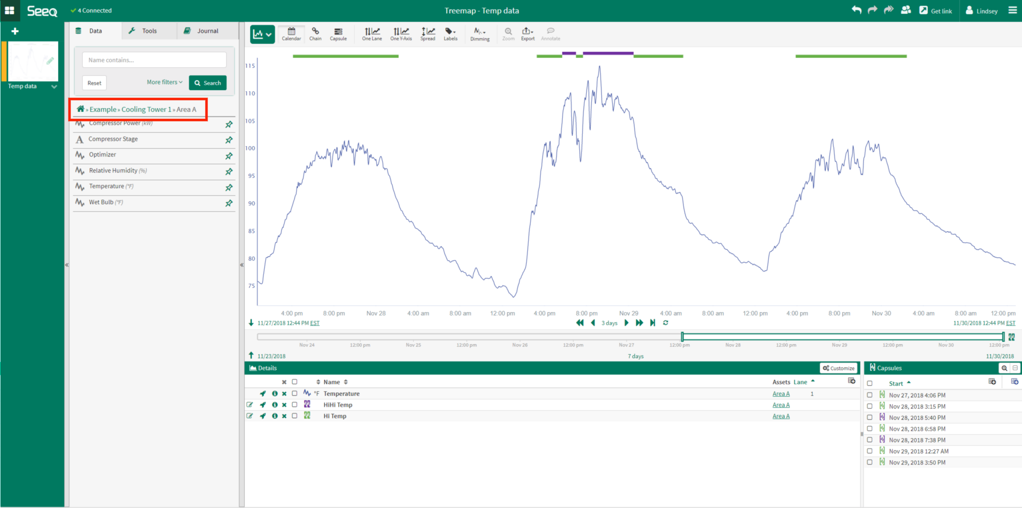 Note: The selected Temperature signal is part of an asset tree with the following structure: Example > Cooling Tower 1 > Area A > Temperature (shown in red box). The Hi Temp and HiHi Temp conditions were created based upon the value of this Temperature signal. When the Treemap is created, it will compare assets similar to Area A that also having a signal called Temperature.