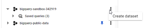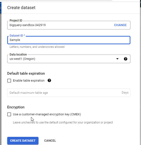 A Create dataset dialog displays. Provide a Dataset ID, choose a Data location, and click CREATE DATASET.