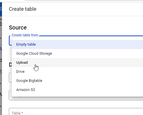 For Create table from, select Upload and then browse for the tag_table.csv that you downloaded.