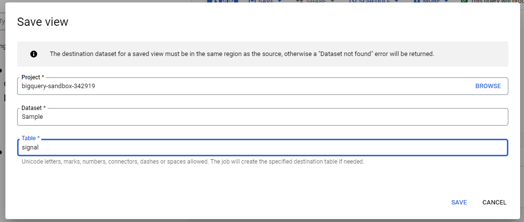 The Save view dialog displays. Select the Sample Dataset, specify signal for Table, and click SAVE.