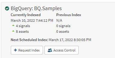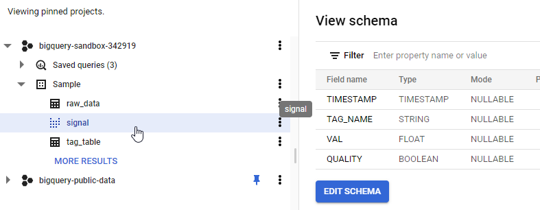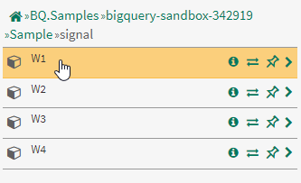 The BigQuery connector uses a configuration pattern for connecting to a BigQuery data warehouse. It requires the name of a project, a dataset, and a table or a view; it also requires the name of the column that represents time and the names of the columns that contain values.