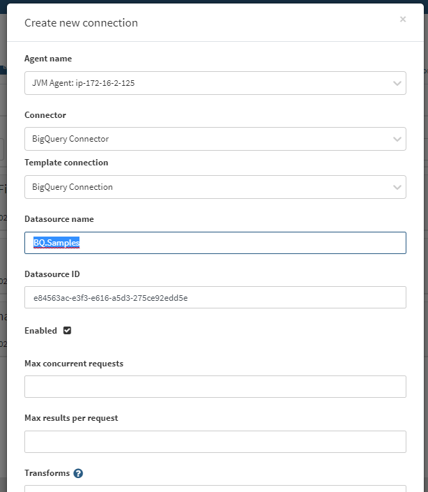 Select the desired Agent name, select the BigQuery Connector, and select the BigQuery Connection Template Connection. Provide a Datasource name and accept the default value for Datasource ID and ignore Max concurrent requests, Max results per request, and Transforms.