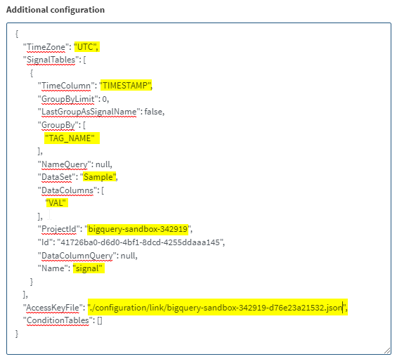 For the Additional configuration, specify the TimeZone, TimeColumn, GroupBy (notice the array), DataSet, DataColumns (notice the array), ProjectId, Name, and AccessKeyFile.