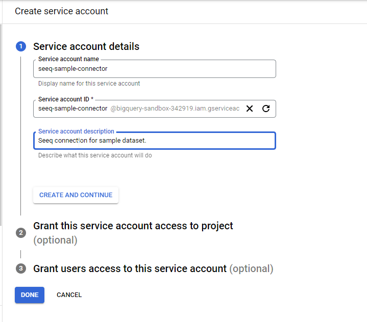 For Service account name, specify something like seeq-connector. A Service account id will be created for you. Provide a Service account description.