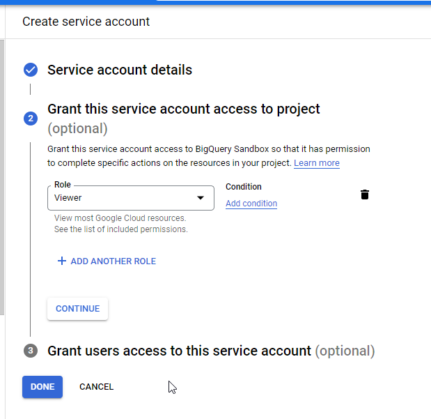 Click CREATE AND CONTINUE. For project access, set the Role to Viewer.