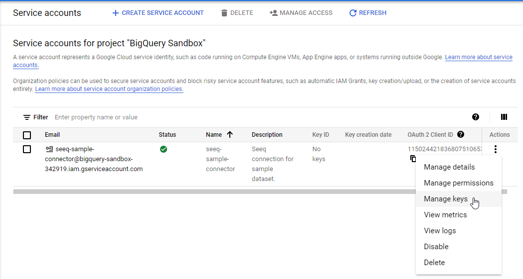 Click DONE. The service account is displayed. Click the options icon and select Manage keys.
