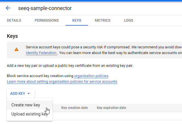 The KEYS tab displays. Click ADD KEY and select Create new key.