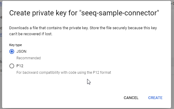 The Create private key dialog displays. Choose JSON and click CREATE.