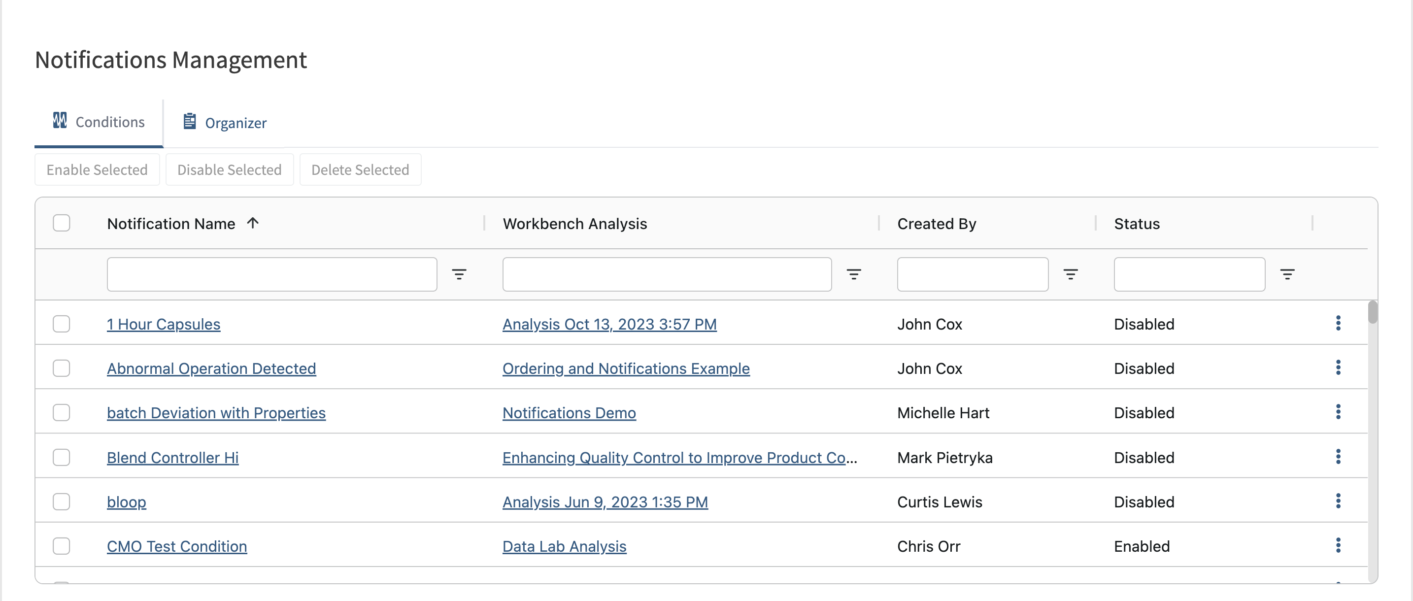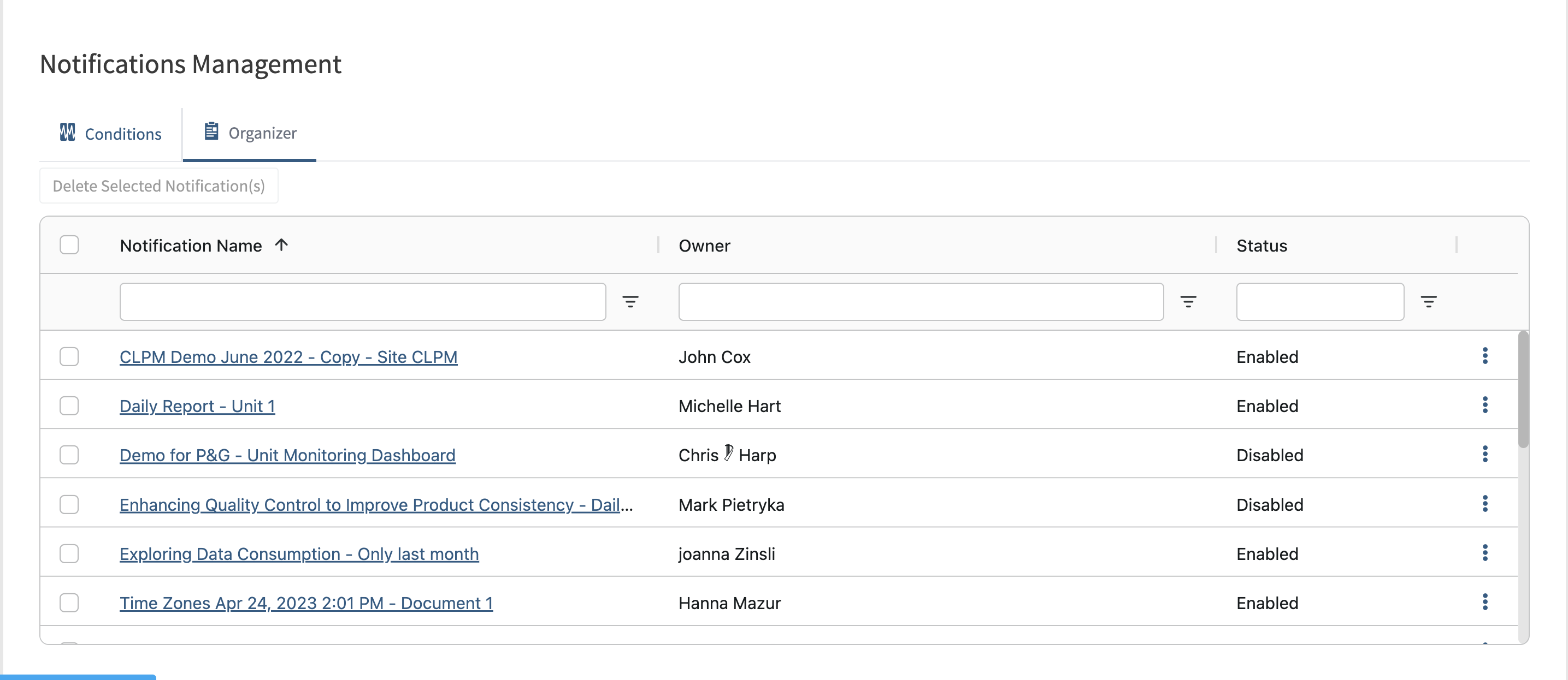 All Seeq email Notifications can be viewed, managed (disabled, enabled, & deleted), and modified (changing frequencies, adding/removing participants, & otherwise modifying other aspects of the notification such as the name and body content) from this page.
