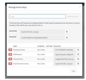 If access key creation is enabled by your administrator, those access keys can authenticate scripts and OData when using Windows, LDAP, or OpenID Connect authentication. Note that Windows Authentication and LDAP support OData export to Power BI and Excel, but users working with OData receivers that are not a Windows product will be able to authenticate with the Access Key and associated password.