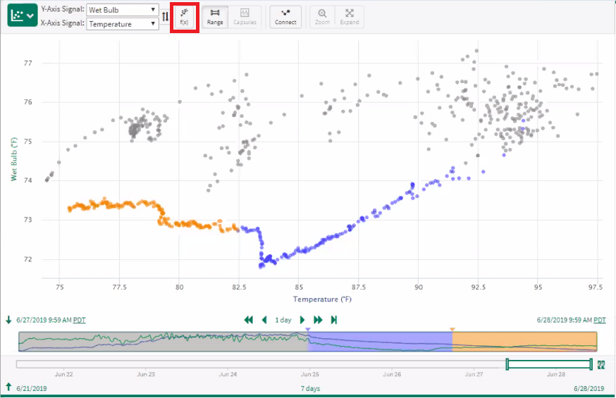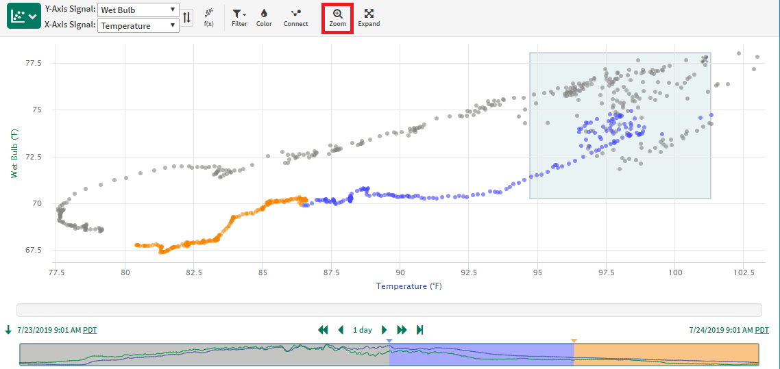 Coloring by relative time is the default when navigating to the XY Plot. The minimap below the XY Plot shows a simple trend of the two signals which are currently being plotted. Three colors can be used to show how the relationship between your signals is changing over time. The oldest data is grey (default 50% of display pane), followed by blue in the middle and the most recent 25% of data is shown in orange. To change the time range represented in each color bucket, drag the arrow between the colors as shown in the screenshot to the right.