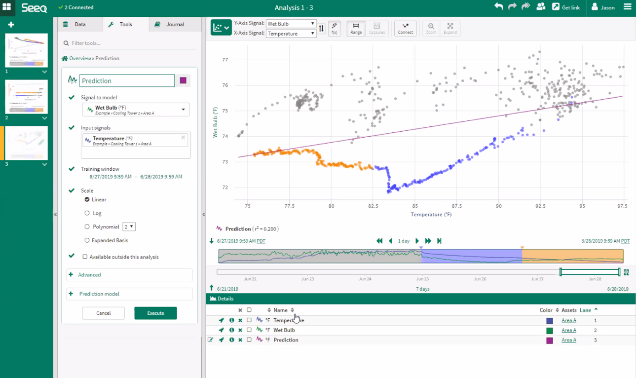Any new single input Prediction created based on the x- and y-axis signals will automatically display after executed. The name and the r squared value are automatically displayed.