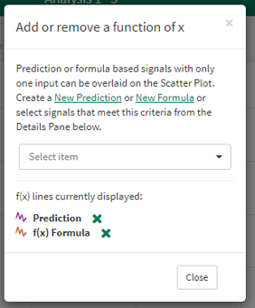 Lines that are functions of a single variable can be added to the XY Plot. This applies to single input Predictions and to Formulas with one signal input and any number of scalar inputs. To add or remove a line, select the