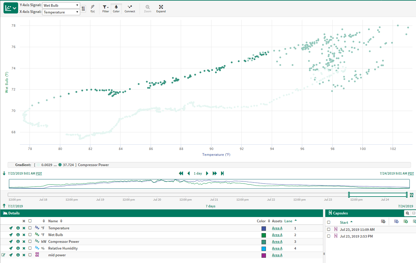 Points can be colored based on the values of a capsule property on any condition in the Details Pane. String-valued properties, as well as a capsule's start and end times, will be colored in rainbow colors. Numeric properties will be colored with a gradient similar to coloring by signal; the base color for this gradient can be changed in the color pop up. If a point on the plot is not within a capsule that has the selected capsule property, then it will be colored by a lower-priority coloring option (e.g. condition, signal, color range, relative time). If any conditions are selected in the Details Pane, then values of the capsule property for these conditions will be used for coloring the XY Plot points. If a point falls within multiple capsules, then the value used for coloring the point will be the capsule property value from the capsule with the earliest start time that has a valid value for the capsule property.